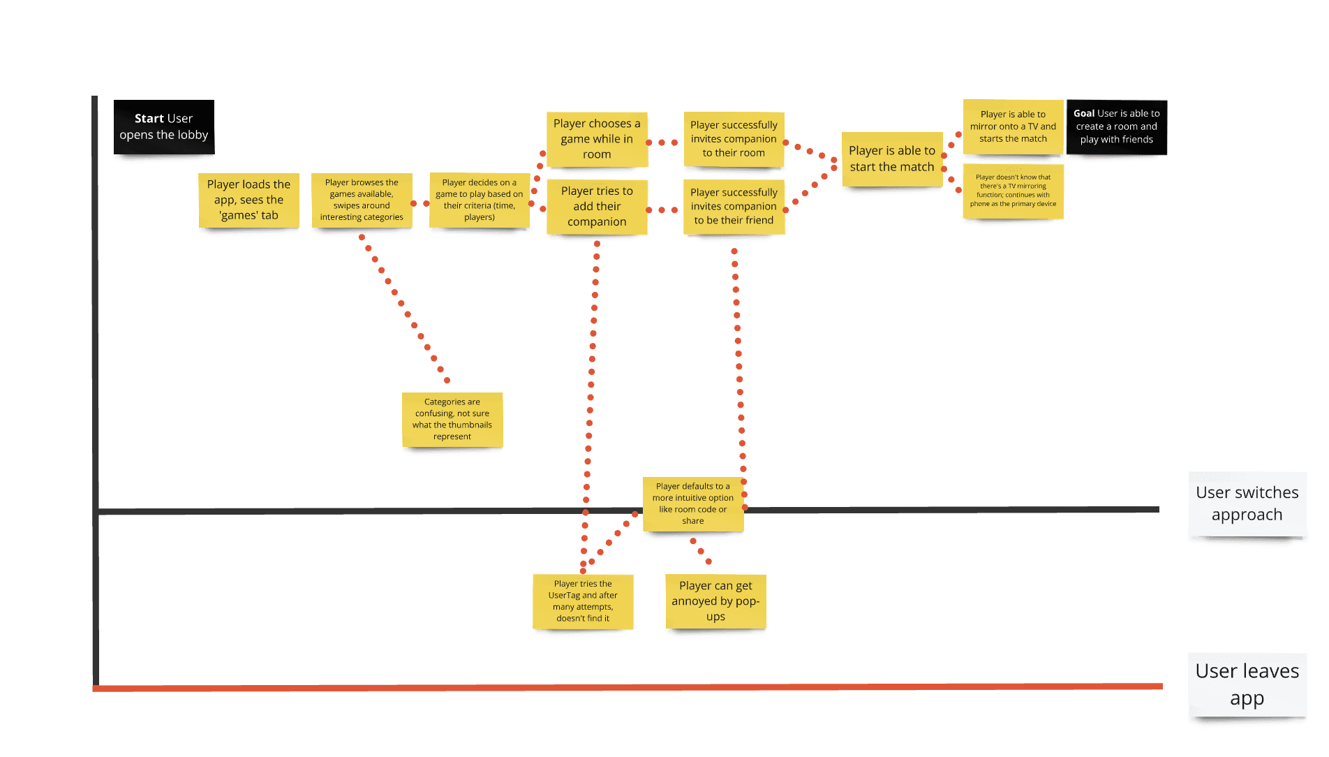 I looked to cover all the major friction points experienced by users when beginning a new multiplayer experience on Boardible. While most of the interviews saw users switching their approach, one can infer that enough of these “switches” could cause a new person — one not being interviewed, perhaps — to leave the app entirely.