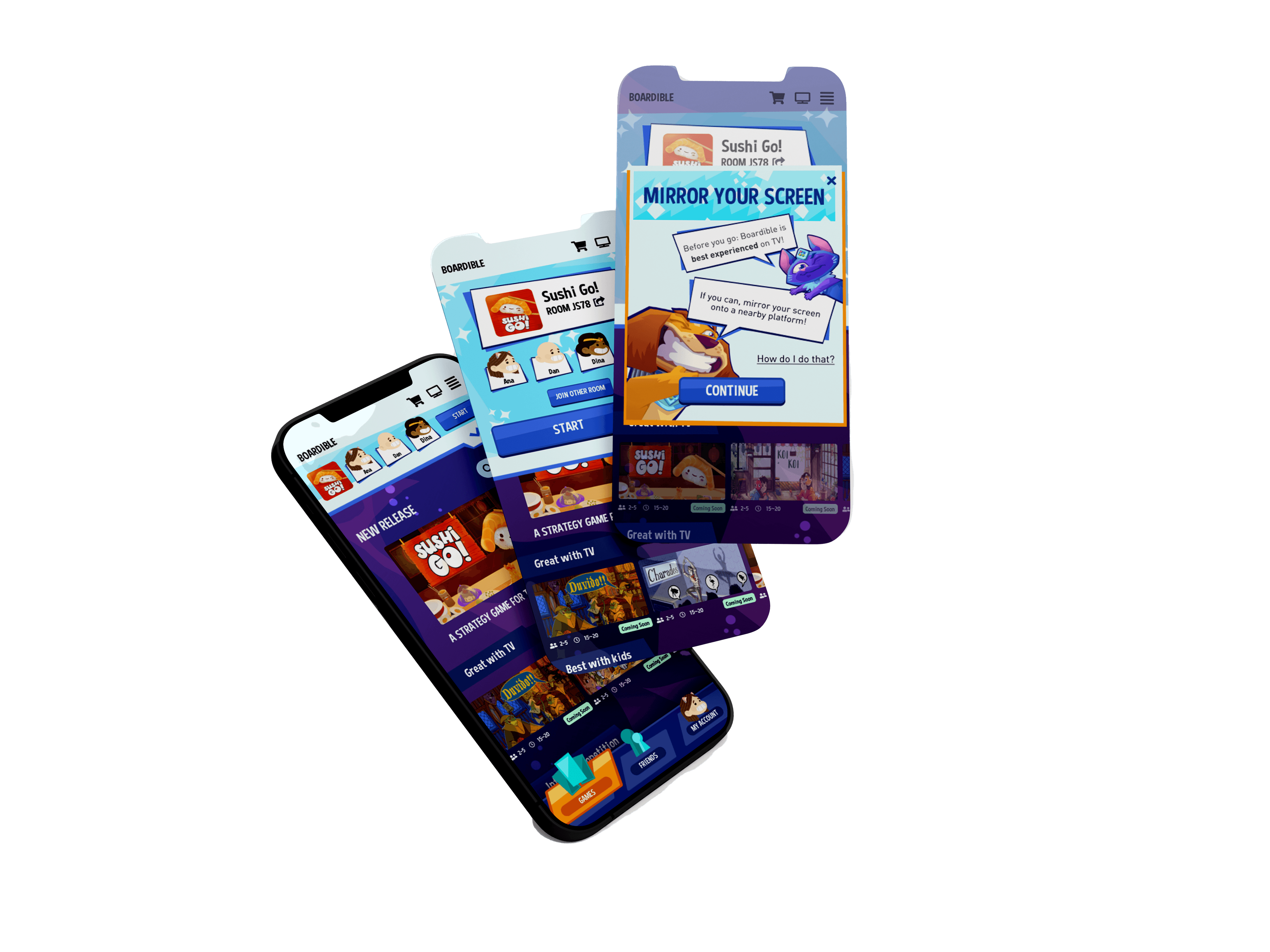 Boardible currently has a TV-specialized set of interfaces for its hosted games, though it was underused by users. Though users could mirror their screens easily with Boardible's current interface, users in a younger demographic (early-stage couples and college students) often did not have access to traditional TVs. Finding ways to communicate Boardible's adaptability to large screen alternatives to TV like laptops, was also a central part of my research.